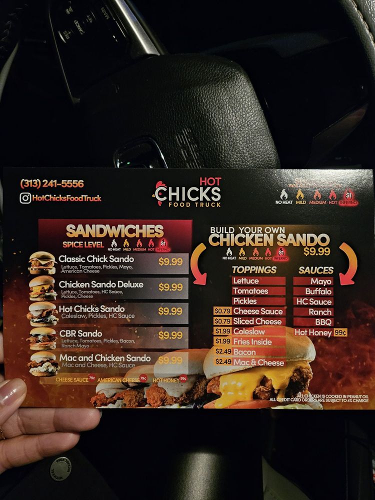 Hot Chicks Food Truck offers amenities such as Takeout, Delivery, Wheelchair Accessible, Pets Welcome, Outdoor Dining, Outdoor Parking, Accepts Contactless Payments, Takeout, Delivery, Wheelchair Accessible, ensuring a comfortable and convenient experience for clients.